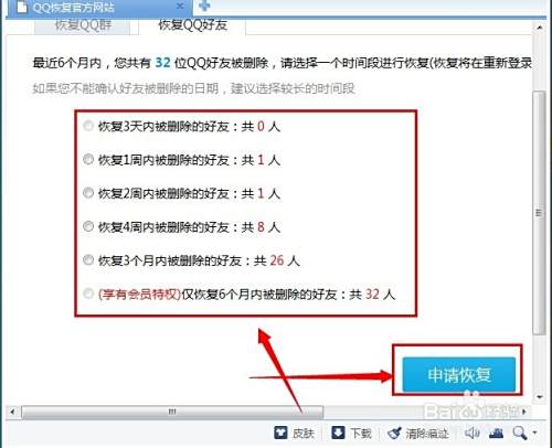 这时我们可以看到可以恢复6个月内被删除的好友,我们可以根据自己的需求去勾选,当然6个月内删除的好友需要是会员的权限才行,勾选需要恢复的好友时间段之后,我们点击“申请恢复” 如图
