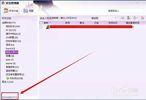 在打开好友管理器之后,我们点击管理器界面的左下角的“找回被删的好友” 如图