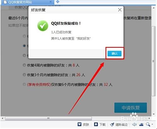 这时会弹出一个提示说已经恢复成功的图,我们点击“确认”,就可以把删除的好友恢复了 是不是很简单呢 如图