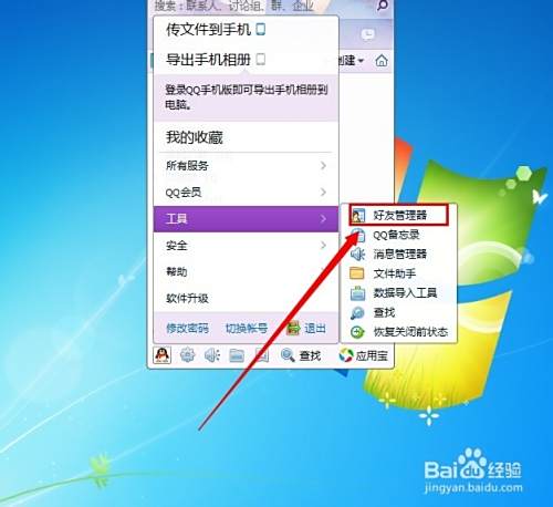 在弹出的选项中,我们点击里面的“工具”,在弹出的选项中,我们点击“好友管理器” 如图
