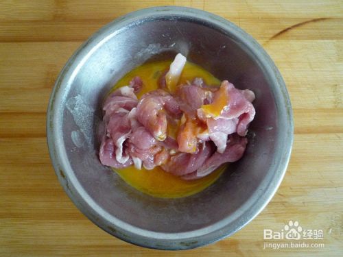 抓匀的肉片中加入半个打散的蛋液再次抓匀,抓匀的肉片均匀的裹上一层干淀粉,裹干淀粉的过程中可以把肉片松松的卷起,这样再炸制的过程中可以让肉片外酥里嫩。