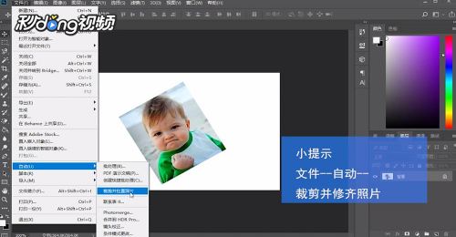 然后鼠标左键单击“文件——自动——裁剪并修齐照片”命令,等待0.5 秒左右照片的裁剪与修齐操作就完成了。