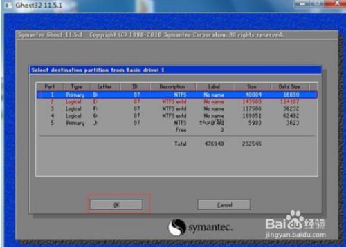 9、选择你想把系统安装到里面的那个盘,然后点OK,这个不能点错,点错了其他盘的数据就没有了。