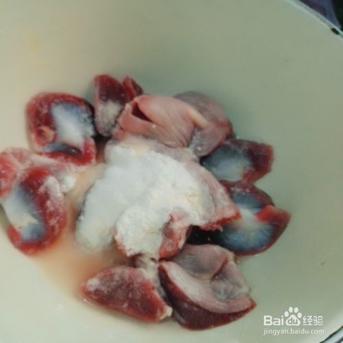 先把鸡胗发一大勺生粉,一大勺料酒,一勺盐用手抓抓,再清洗干净控水备用。