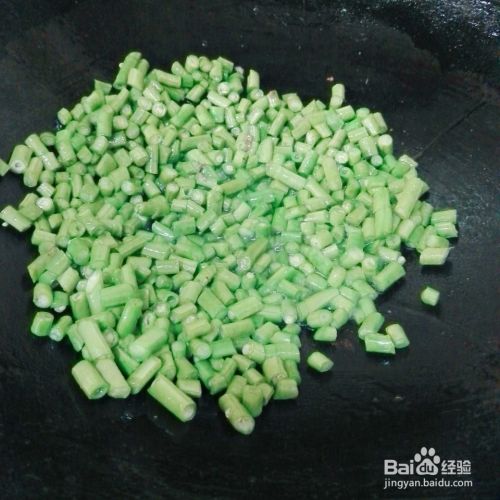 另起锅,放少量花生油,来炒豆角,豆角要切碎。一般一二分钟就炒熟了,豆角炒好后,把炒好的鸡胗倒进去,把泡椒倒进去,加一勺盐今去。