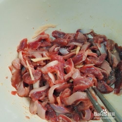 再把鸡胗切成片,放生粉,蚝油,鸡粉,姜丝,料酒,盐搅拌均匀后腌十分钟。