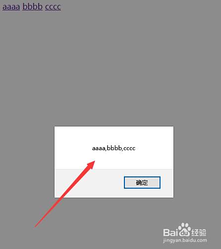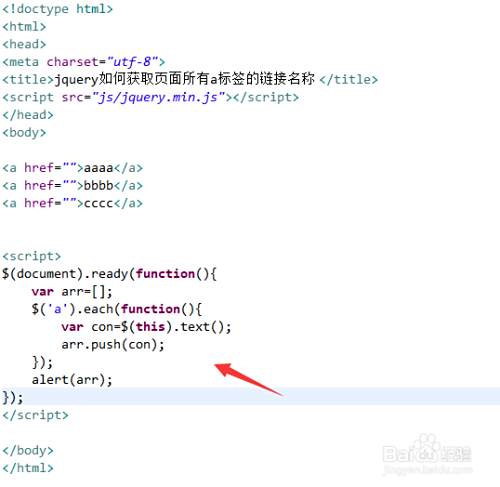 4、在function方法内,通过获得a标签对象,使用each方法遍历a标签,通过text方法获得a标签的链接名称,并使用push方法将其保存在arr数组中。最后,使用alert输出数组。