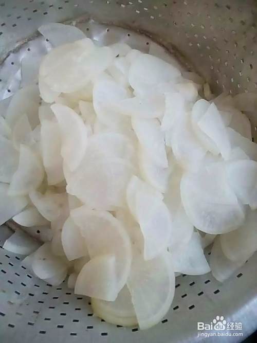 把萝卜切成片,放入沸水里焯一下,捞出来,剁碎,混入馅儿里