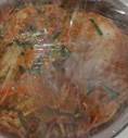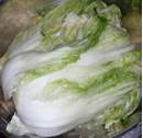 先拿一半白菜放盆里,把拌好的配料一层一层抹在白菜上。抹好以后,把菜放盆里压一压。