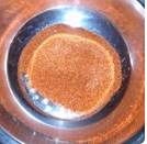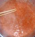梨削好皮,放盐水里泡一下。(梨不会变色)。辣椒面放在没有水的盆里(一定要把盆擦干)。