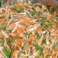 把所有切好丝配料放进辣椒面的盆里拌匀。加糖,雪碧拌匀。