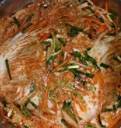 清水倒在盆里,把白菜一层一层加盐腌5个小时,把水挤干。梨、白萝卜、胡萝卜、白圆葱洗干净切丝备用。韭菜控干水,切断备用。