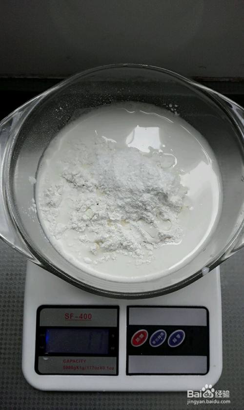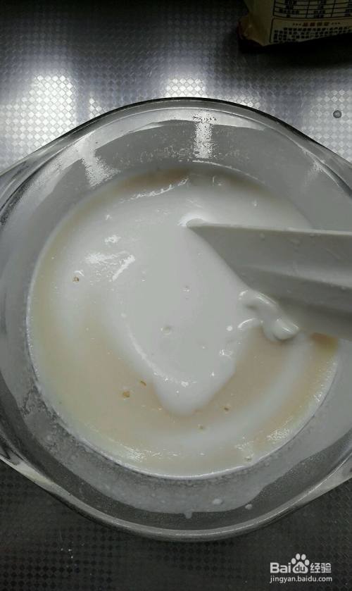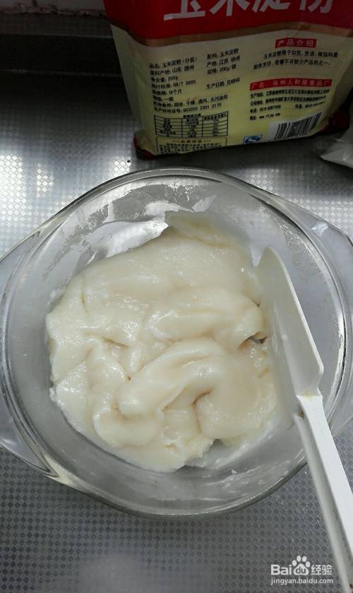 准备带盖的玻璃碗,依次放入牛奶,幼砂糖,白油拌匀。再倒入淀粉和200g糯米粉.用打蛋器拌至完全混合,没有颗粒。