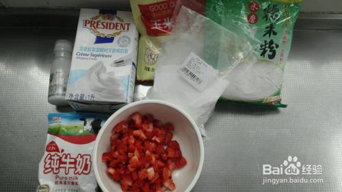 准备所有的食材。 炒糯米粉,将50g生糯米粉用锅小火炒至微黄或者将生糯米粉放烤箱150度大约15分钟,颜色微黄就可以了。待用。