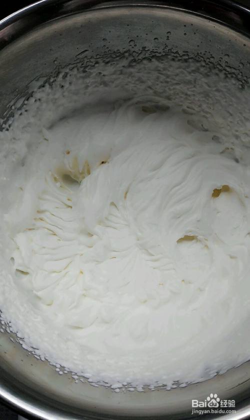 稍微放凉以后,手沾一些熟糯米粉把面团揉匀放凉。一定要盖上保鲜膜,要不然会风干。这时候打发奶油,200g淡奶油加砂糖打发成羽毛状备用。