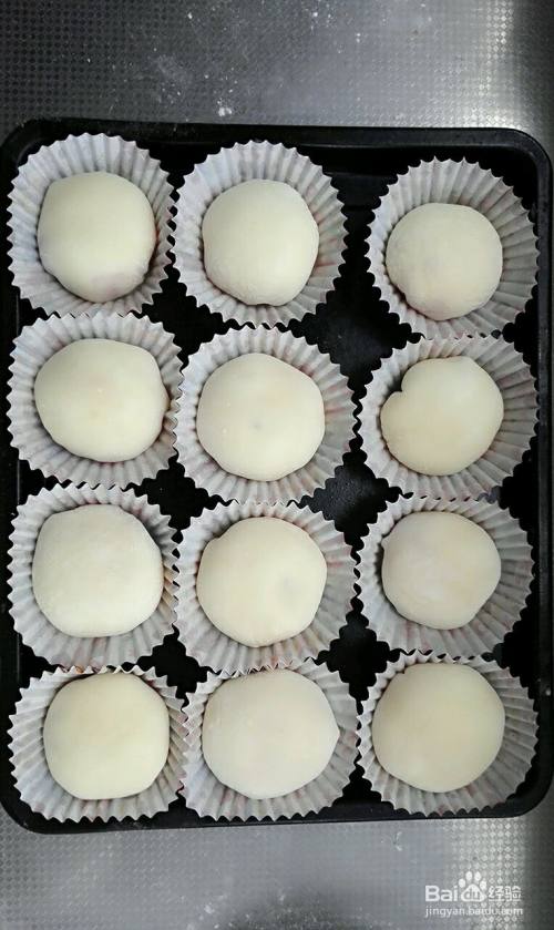 滚上一层熟糯米粉,收口朝下,滚圆,放入纸杯托中。