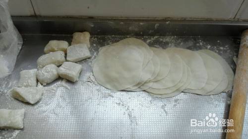 面团稍微凉后,我分成24个小面团,取一个小面团粘上熟糯米粉用擀面杖擀成圆形薄片,中间厚,四周薄。(在擀皮期间其余的小面团和擀完的面片一定要盖上保鲜膜,容易风干,影响美观和口感。速度快一点就可以了)