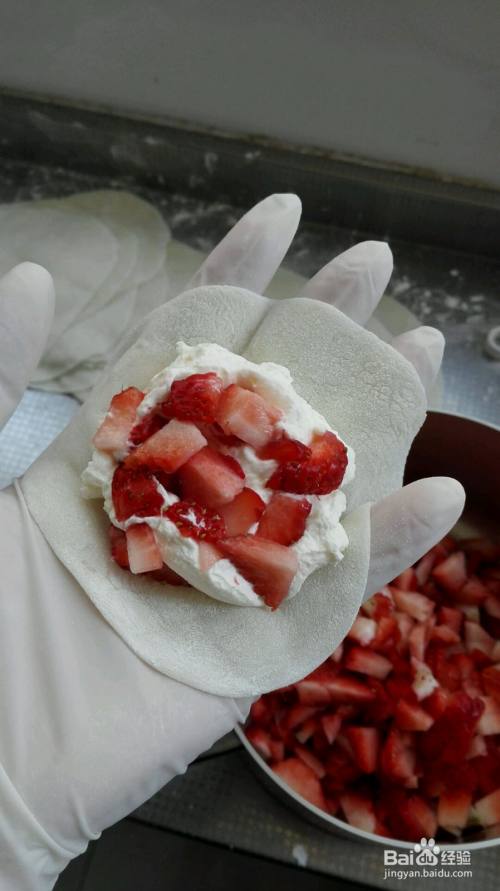 面片里放入适量的奶油和水果,像包包子一样小心收口,捏严。
