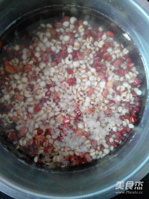 红豆煮烂后加入冰糖和糯米,然后就熬啊熬啊熬啊