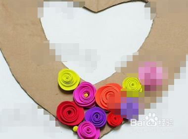 小伙伴们,我们将旋涡条从边上卷起,一直卷到中间底部,在底部挤上溶胶粘在海绵纸上,将海绵纸裁成长三角形做成涡形卷,来填玫瑰之间的空隙,如图所示。