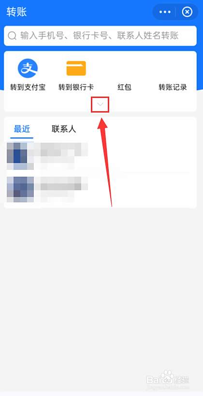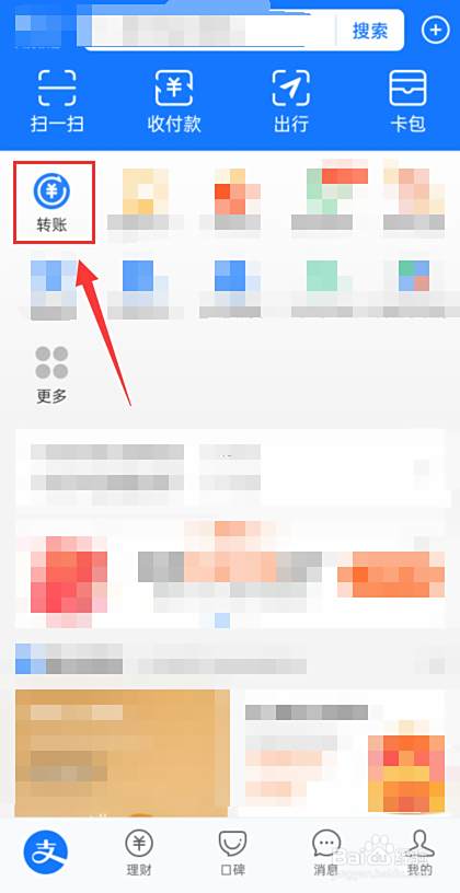 我们进入支付宝APP后,在首页,点击页面上的转账。