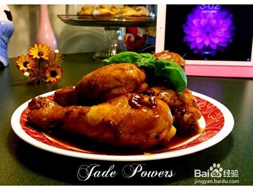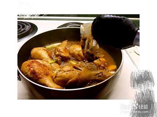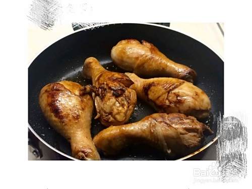 鸡腿逐个抹上红烧酱汁,加入锅中煎至金黄。