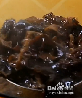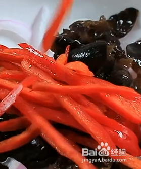 然后再将红彩椒切成丝,泡发好的木耳去掉根部改刀,焯水捞出,过凉水备用