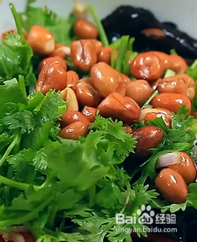 再倒入香菜、熟花生米、芝麻香油,再次搅拌均匀,即可享用