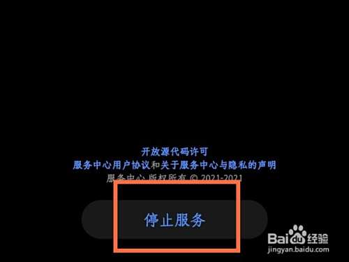 在关于页面点击底部的【停止服务】即可,如图所示。