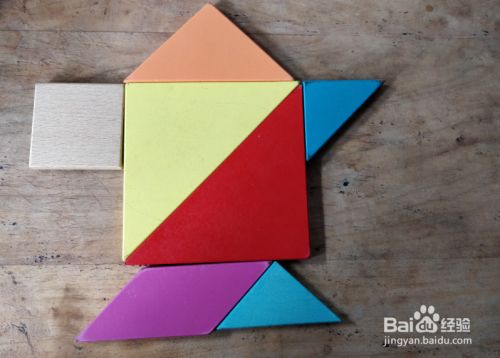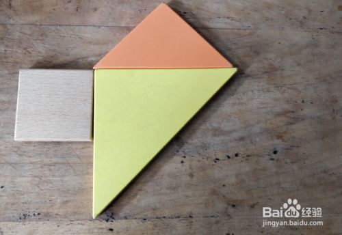 摆上蓝色三角形,放在平行四边形右侧挨着,直角向上,如图。这样就拼组好了。