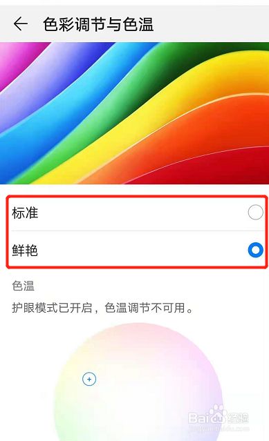 华为手机显示标准还是鲜艳,需要在显示页面点击色彩调节与色温,根据所需调整标准或者鲜艳即可。