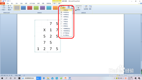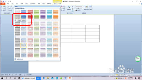 在PPT2010中单击“插入”选项卡,在“表格”组单击“表格”按钮,在下拉列表中选择“4*5表格”,接着单击“表格工具”的“设计”选项卡,在“表格样式”组选择“无样式,网格型”。