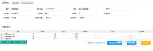 具体操作是,在订单录入界面,输入客户信息以及产品信息,产品可下拉选择产品库中的产品,填入数量,即可自动填充产品信息以及合计产品总金额。
