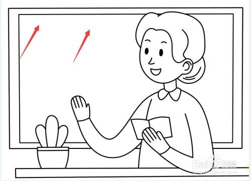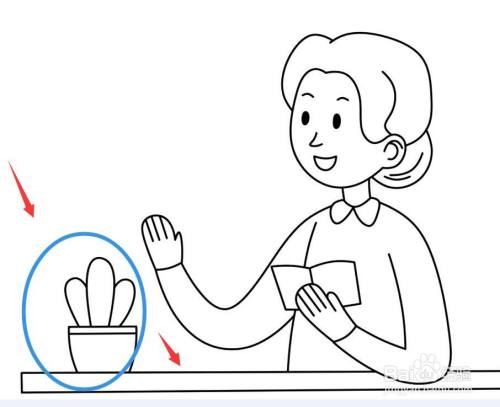 在老师的旁边,画一个小矩形代表课桌,摆一盆仙人掌。