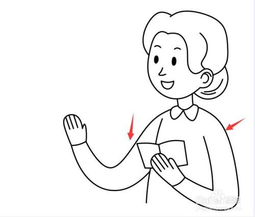 画出身体部分,画出老师手部的姿势,拿着一本书。