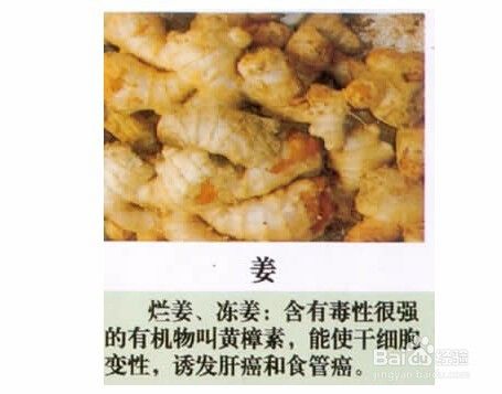 5、腐烂的生姜:生姜是调味剂,一遍烧菜都会放一些,所以家中都会有储存,不过时间一长的话,容易腐烂,腐烂的生姜是不能吃的,其中含有黄樟素,能够导致干细胞中毒。