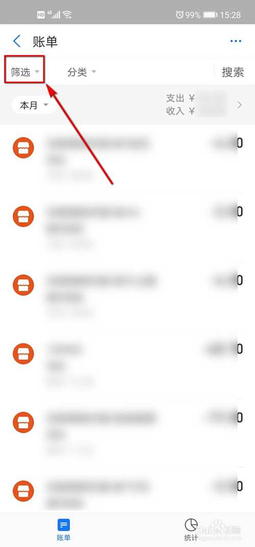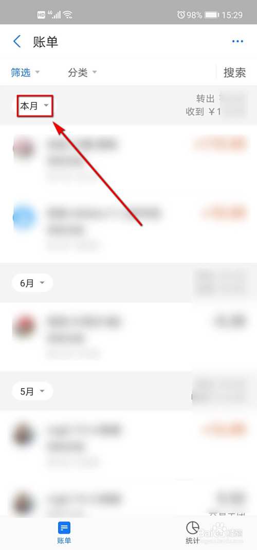 接着就可以在账单页面看到最近几个月的转账记录,如果想要具体到某个时间段的转账查询,先单击【本月】选项。