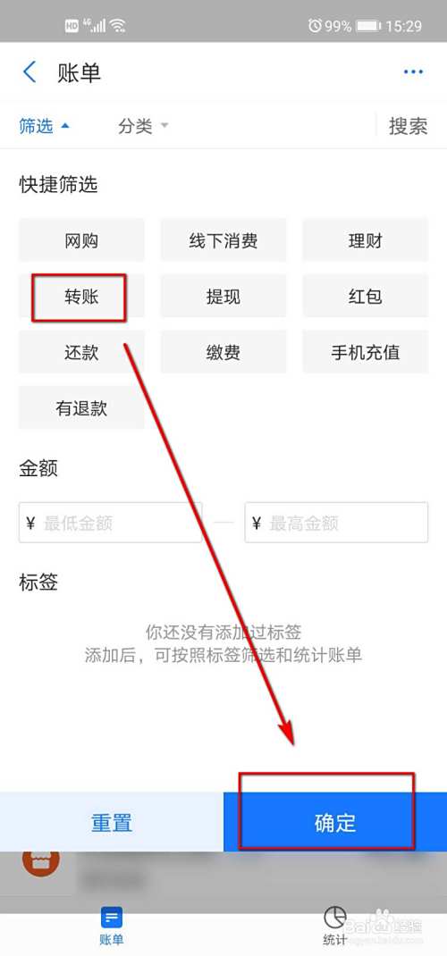 在弹出的列表中选中【转账】选项,再点击【确定】按钮。