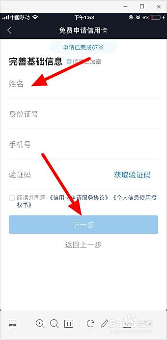 完善基础信息,包括姓名、身份证号等,获取并输入验证码,勾选同意协议,然后进入“下一步”申请即可。