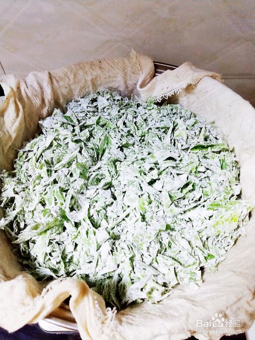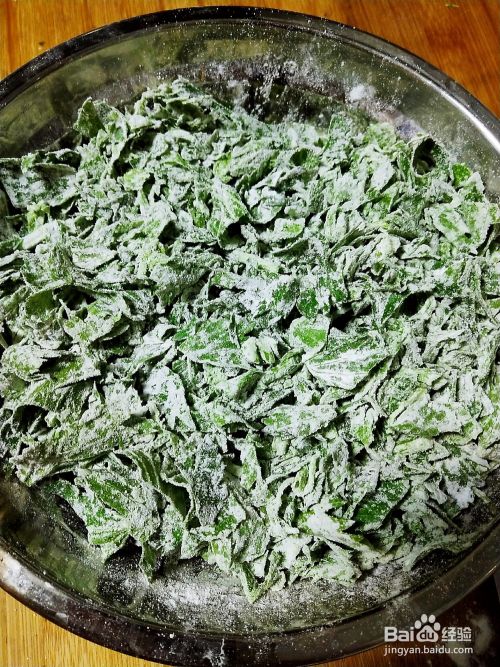 撒上面粉,边撒边搅拌,直到每个叶子上面都裹上面粉。