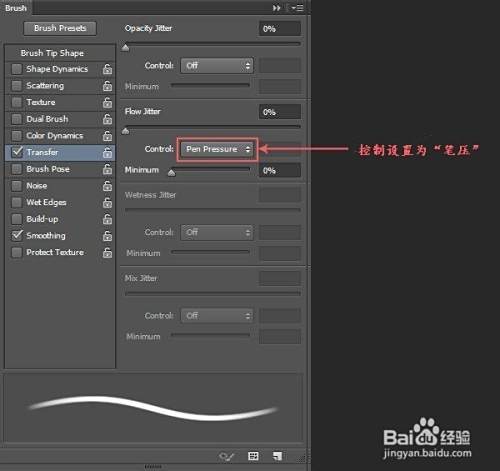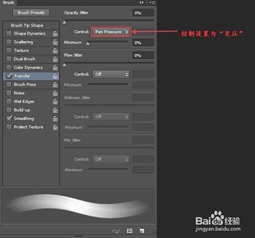 现在,我们将添加平滑融合到人物皮肤。选择涂抹工具按N和按“F5”来访问画笔面板。选择的尺寸为20像素,硬度为0%和间隔25%的刷子。设置散射到38%,并数到三然后去转,并设置“流动抖动”笔压力。不要忘了把平滑ON。保存的刷并将其重命名为“勾兑”。