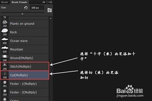 现在我们将添加切与针的角色。选择“剪切(乘)”刷,改变它的颜色为#1d1f11and增加削减皮肤。选择“史迪仔(乘)”刷加针。