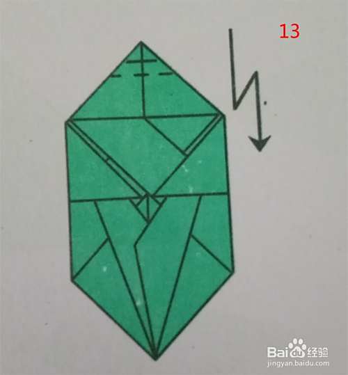 步骤12:沿虚线朝箭头方向折叠,效果如图13,如下图所示