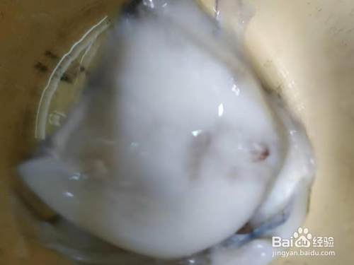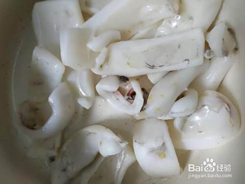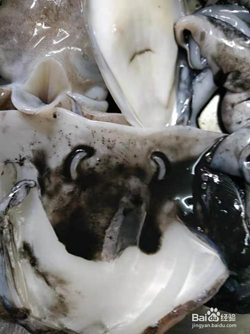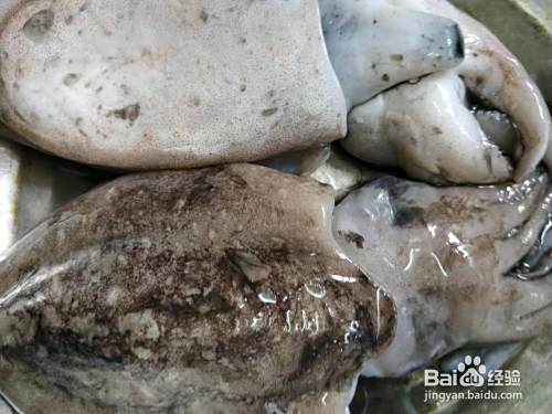 处理乌贼,把乌贼背部剪开,去掉墨鱼骨、内脏、剥掉外皮