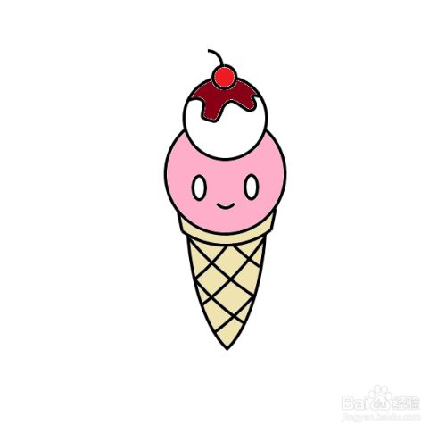 给大冰淇淋球画上眼睛和嘴巴,中冰淇淋球画上巧克力纹,别忘了再给最上面的水果加上个果柄增加真实感。