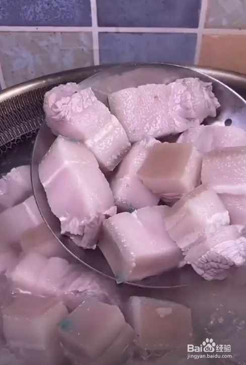 将五花肉切成小块,切好的五花肉凉水下锅,来点去腥的料酒,抄好捞出,用清水多清洗几遍。