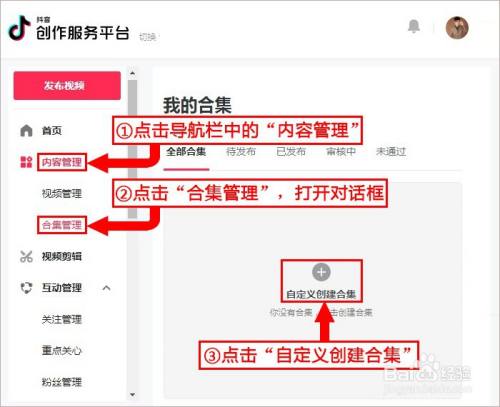 合集管理。点击导航栏中的“内容管理”;点击“合集管理”,打开对话框;点击“自定义创建合集”。