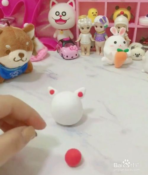 第二步:白色黏土揉搓成小耳朵,加上可爱的红色黏土,如图所示