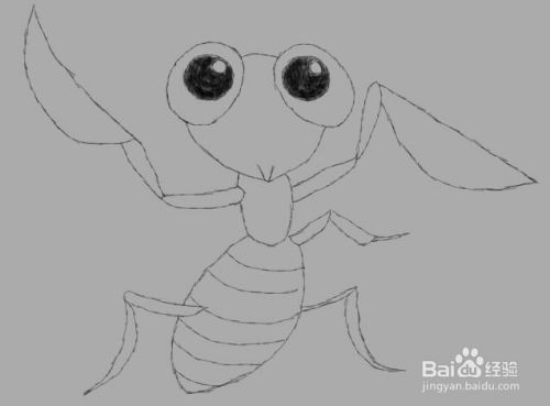 在眼睛轮廓线内画出螳螂的黑白眼珠,如图所示: