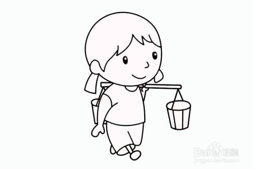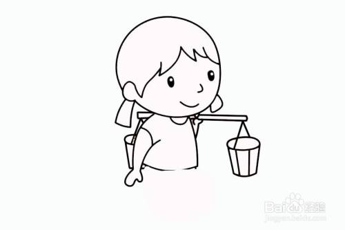 再画出挑水的小女孩的身体和挑的水桶。